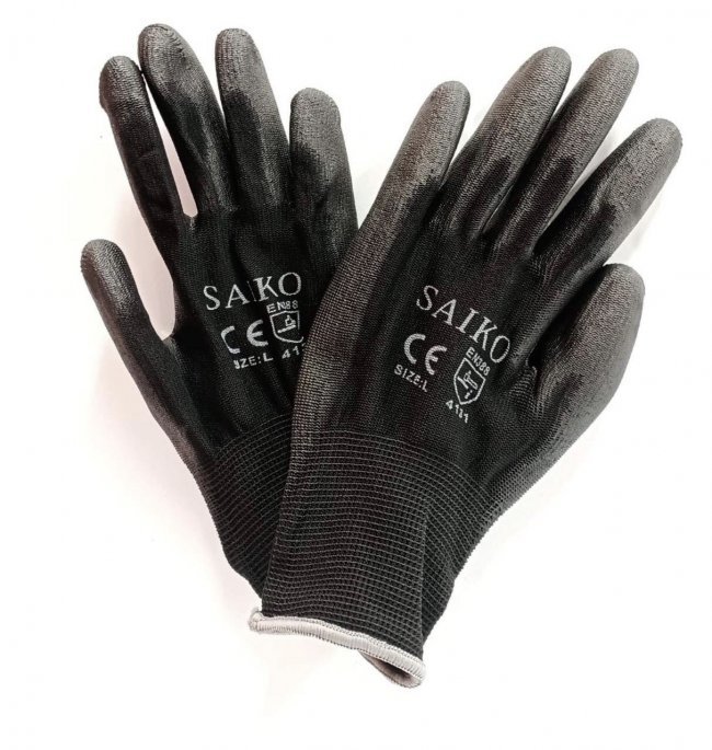 ถุงมือPUเต็มฝ่ามือสีดำ SAIKO รหัส : 284 ราคา : 15 บาท/คู่ .- ประเภท : ถุงมือไนล่อนเคลือบ PU เต็มฝ่ามือ สีดำ SAIKO